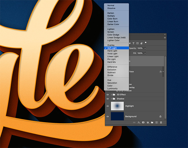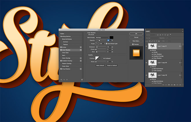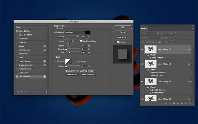 Apply a Drop Shadow, but set the Angle to 135 so the shadow is cast diagonally over the 3D effect. Configure the Blend Mode to Overlay, then adjust the Distance and Size to 20px and 80px so the shadow smoothly fades out.