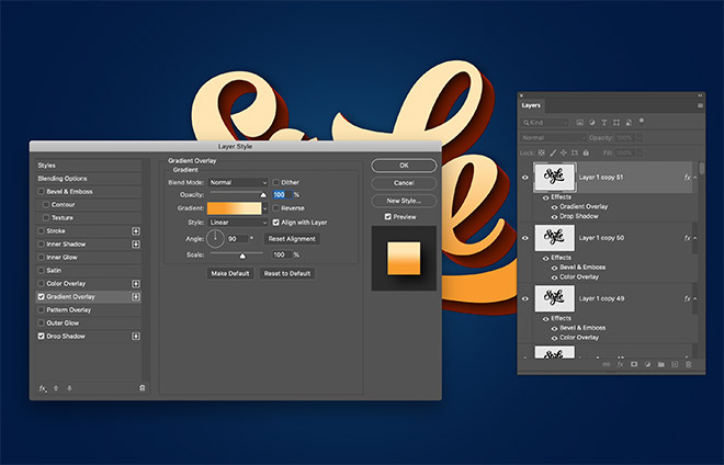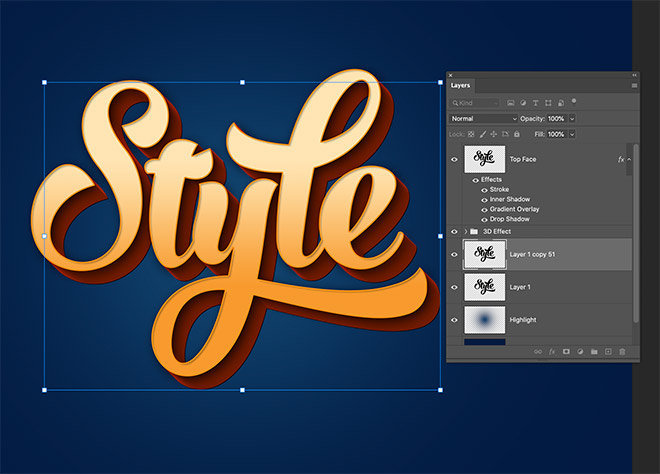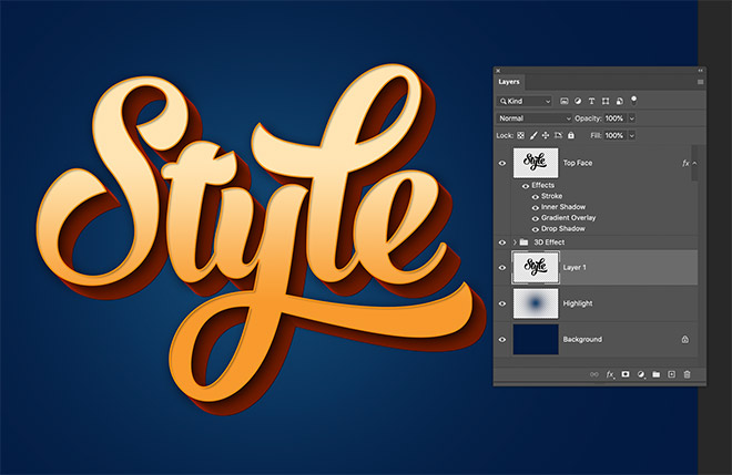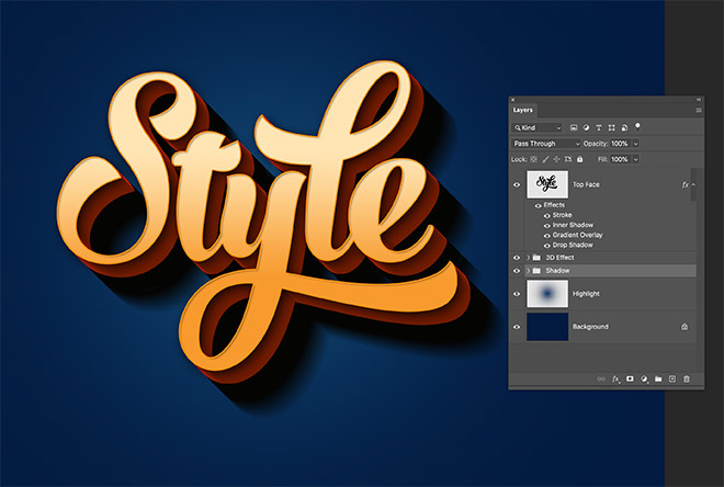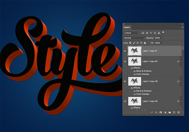 The shading that is applied by the Bevel and Emboss layer style generates a realistic 3D effect as each layer is built upon by the next. Double-click the top layer to apply some layer styles to the text face.