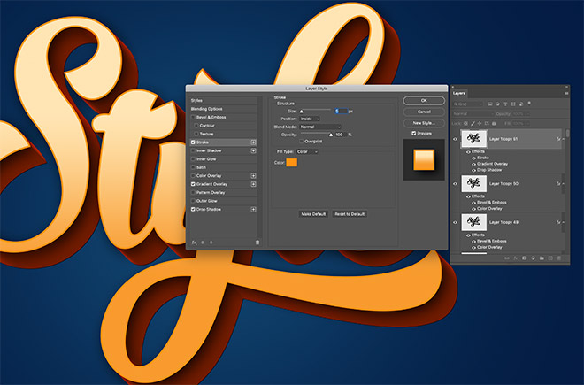Other interesting effects can be produced by combining more layer styles. Add a Stroke using the same #f89b2e from the gradient. Set the side to 5px and position to Inside.