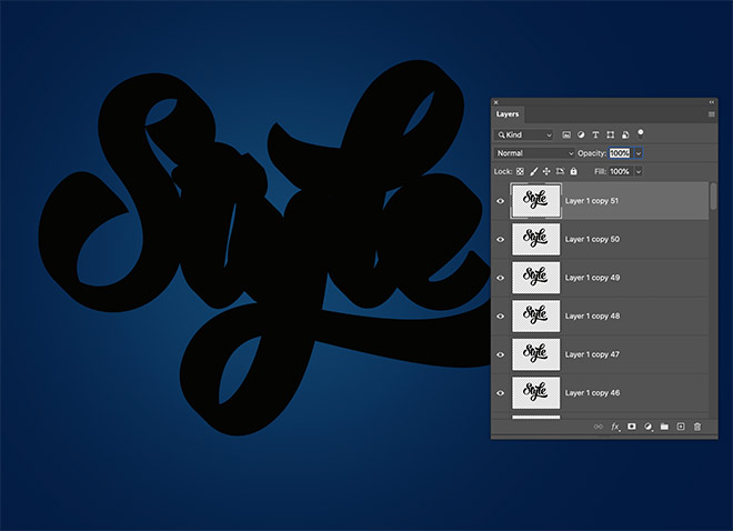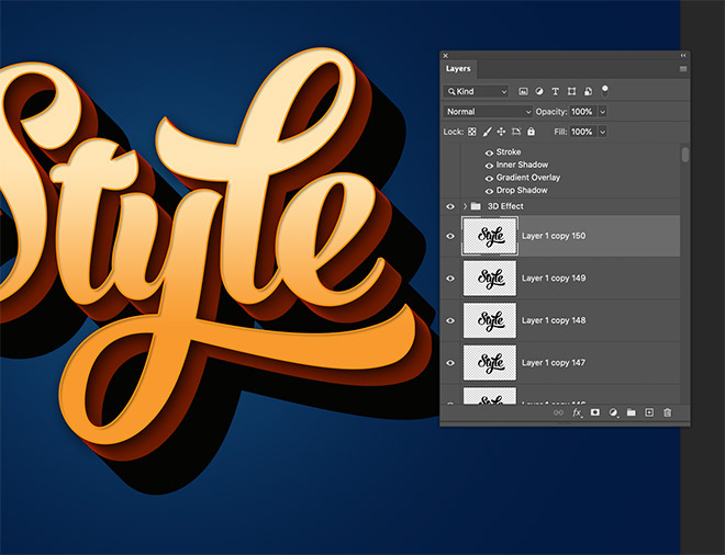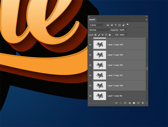 Repeatedly press the CMD+ALT+Shift+T shortcut for Transform Again multiple times to extend the shadow. Create 100 new layers, taking the layer count to 150.
