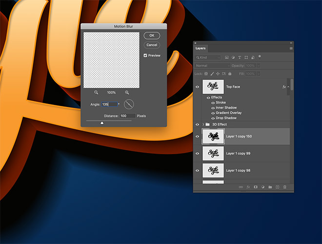 Go to Filter > Blur > Motion Blur. Configure the angle to 135 degrees and set the blur Distance to 100px.
