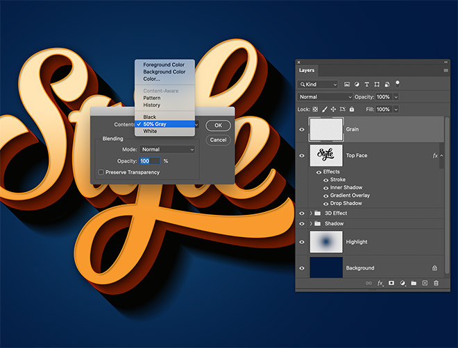 As a finishing touch, add a new layer at the top of the layer stack. Go to Edit > Fill and choose 50% Gray.