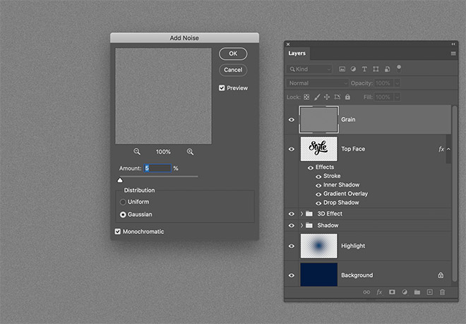 Under Filter > Noise > Add Noise, configure the settings to 5%, Gaussian, and check the Monochromatic option.