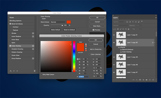 Apply a Color Overlay to change the colour. I’m using #e33601.