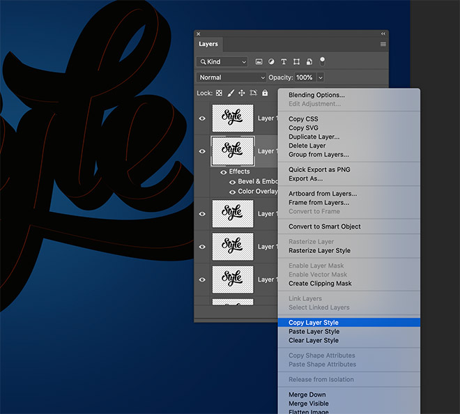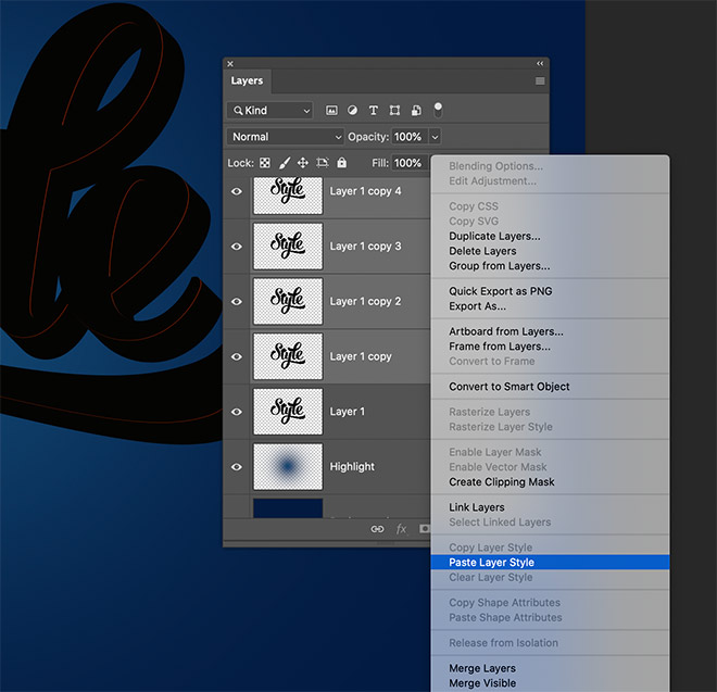 Shift+Click the first Layer copy to select every single layer in between, then right click and choose Paste Layer Style.