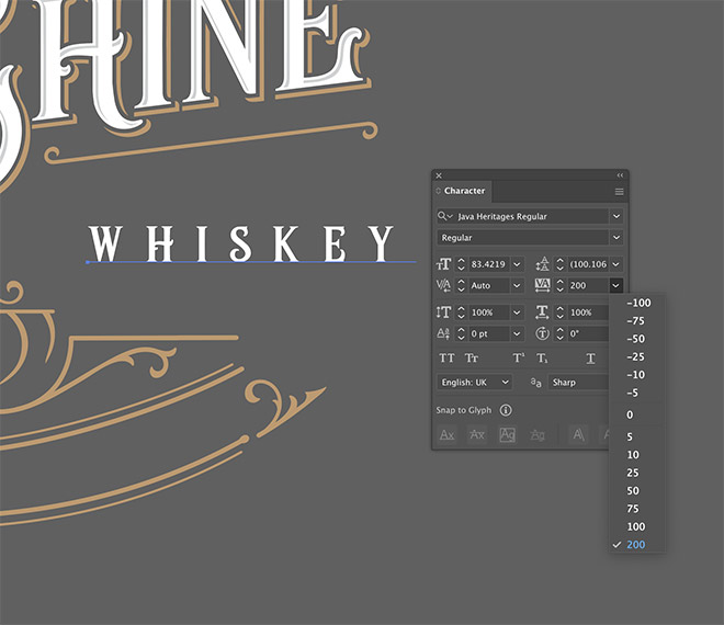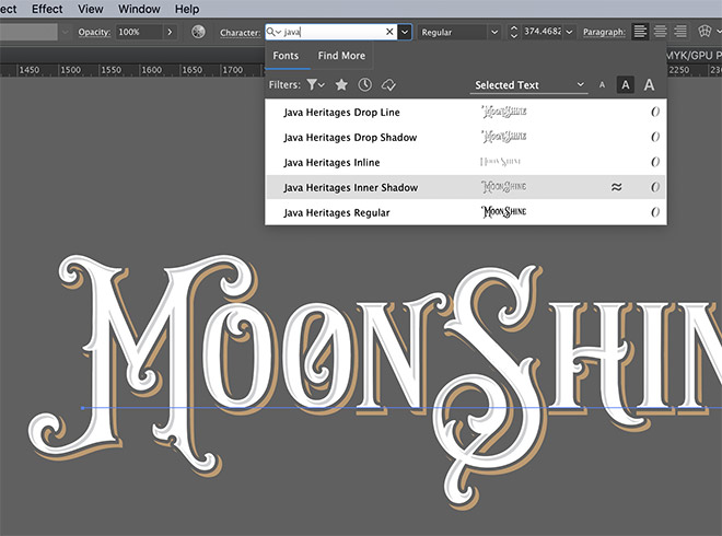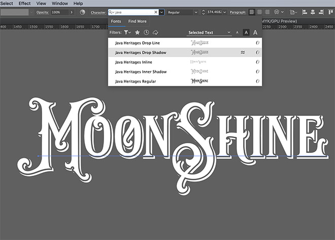 To begin creating your vintage whiskey bottle label design, open Adobe Illustrator and create a new document. Since we will be using white as a fill colour, I prefer to work in the empty grey area beyond the artboard. Java Heritages has two sets of stylistic alternates. By highlighting each character, you can see the alternative glyphs available for each letter.