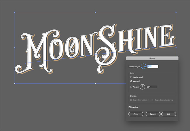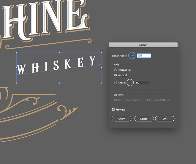 To give the text some additional flair, go to Object > Transform > Shear. Click the Vertical option, then enter -7 degrees to give the text a rise effect.