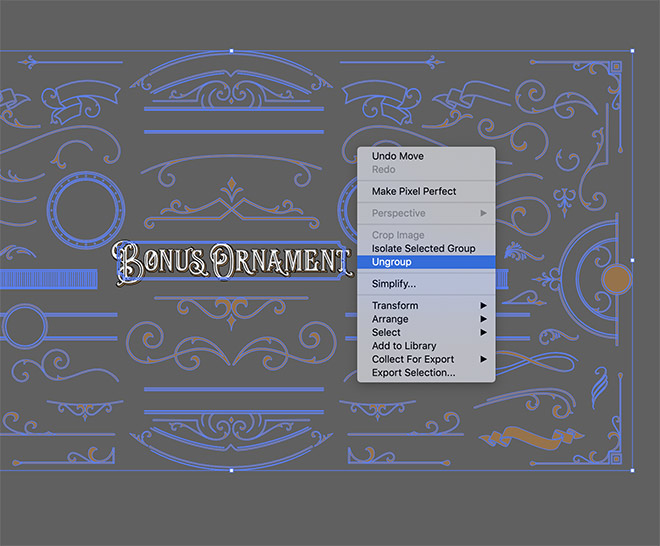 Included in the Java Heritages package is a collection of bonus ornament elements, and ready-made badge layouts. These elements can be used to quickly build intricate designs without the need to illustrate each decorative shape first. It’s necessary to break apart the elements to they can be selected individually, right click and choose Ungroup.