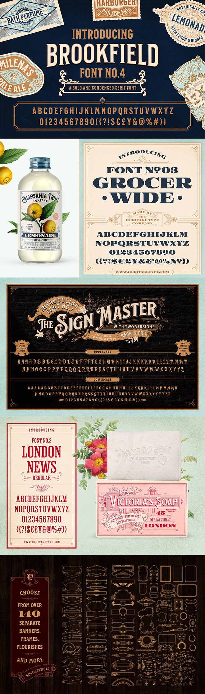 My friends at Heritage Type Co. recently launched a magnificent new collection of vintage fonts and ready-made label designs. If you love the detailed design style of vintage branding with ornate embellishments, this extensive set of tools and resources may be just what you’re looking for to create nostalgic logos, packaging designs, posters, wedding invitations, and much more! The Nostalgic Font and Label Collection is currently on sale with $50 off, but Spoon Graphics readers get an additional 20% off using the code SPOON20, which works out to a total of 34% off the regular price.