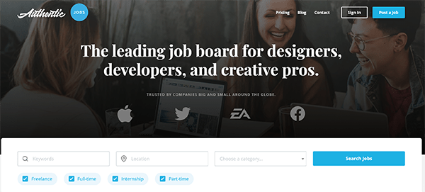 Authentic Jobs states that they’re the leading job board for designers, developers, and creative pros. They’re not WordPress specific, however, you can type keywords in to narrow your search.