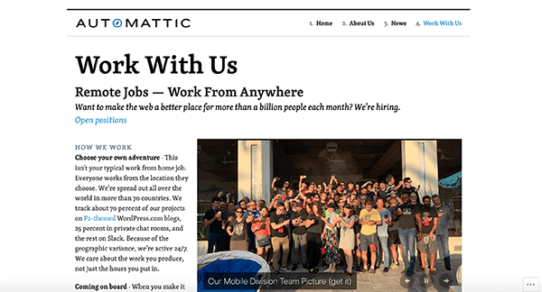 Automattic consists of folks behind WordPress.com, WooCommerce, Tumblr, and more. They’re looking for “Automatticians” that are curious, driven, compassionate, tenacious, autonomous, friendly, independent, collaborative, communicative, supportive, self-motivated, and amazing with GIFs.