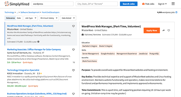 Simply Hired is a marketplace where you can browse many WordPress developer jobs. Plus, they help your job search with their free online resume builder, job tools, and even job advice guides.