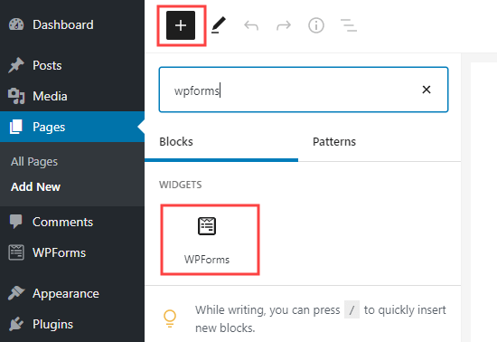 First, you need to click the + icon to add a new block. Then, search for the WPForms block and add it to your content area: